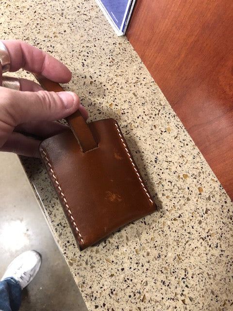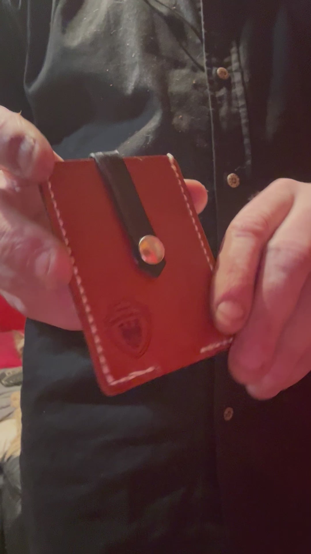 This wallet is amazing, unique and just truly practical. This is a true Brunner's Metalwear original design. This wallet has a leather strip that keeps the cards inside and as you open it, you pull the strip up to pull out your cards. Then you just push all the cards back in the push the strip back down and then you snap it closed. That simple.