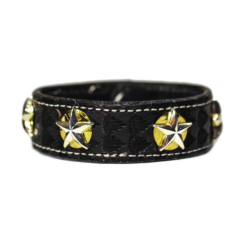 1” Black leather band, brass and nickel.